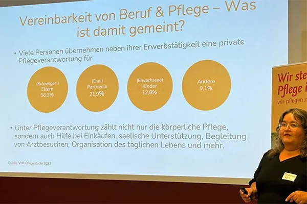 Interessante Einblicke in die betriebliche Situation pflegender Angehöriger lieferte auch eine nicht repräsentative Mitgliederbefragung, die von wir pflegen-Vorständin Edeltraut Hütte-Schmitz präsentiert wurde. Ihr Fazit: "Es sind hauptsächlich Maßnahmen, die in Betrieben ganz allgemein und nicht speziell für pflegende Angehörige gelten, die die Vereinbarkeit erleichtern, wie beispielsweise flexible Arbeitszeiten und die Möglichkeit zum Homeoffice."