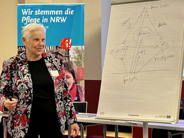 Dr. Notburga Ott, Vorständin von wir pflegen NRW, wies in ihren Erläuterungen zu den arbeits- und sozialrechtlichen Rahmenbedingungen darauf hin, dass diese teilweise zu starr geregelt seien. "Pflegezeitgesetz und Familienpflegezeitgesetz sind wichtige gesetzliche Schritte. In ihrer Ausgestaltung sind sie aber weit von der Realität pflegender Angehöriger entfernt", kritisierte sie. Das zeige sich auch in der geringen Inanspruchnahme. Oft sei es für pflegende Angehörige einfacher, sich selbst krank zu melden, wie mehrere Wortmeldungen aus dem Publikum bestätigten.
